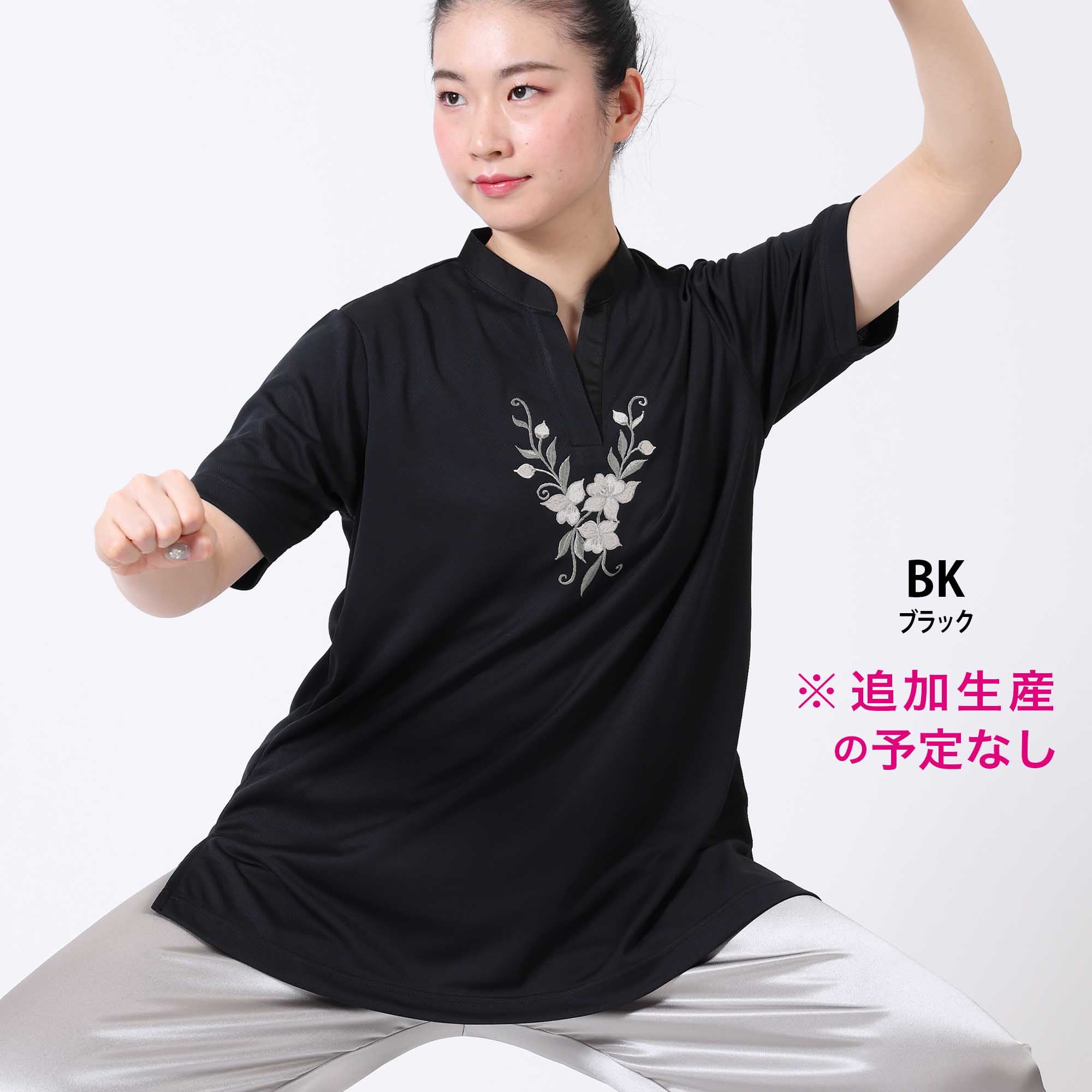 チャイナ衿の雰囲気を残しながら、スッキリ綺麗を実現!クロスVネックに開いた首元に、穏やかな花の刺繍を配した大人映えするデザインです。素材:機能性素材 ポリエステル 95% ポリウレタン 5%衿の形状:クロスVネック スタンドカラー被りモチーフの手法:刺繍配色: GY(グレー) NB(ネイビー) BK(ブラック)