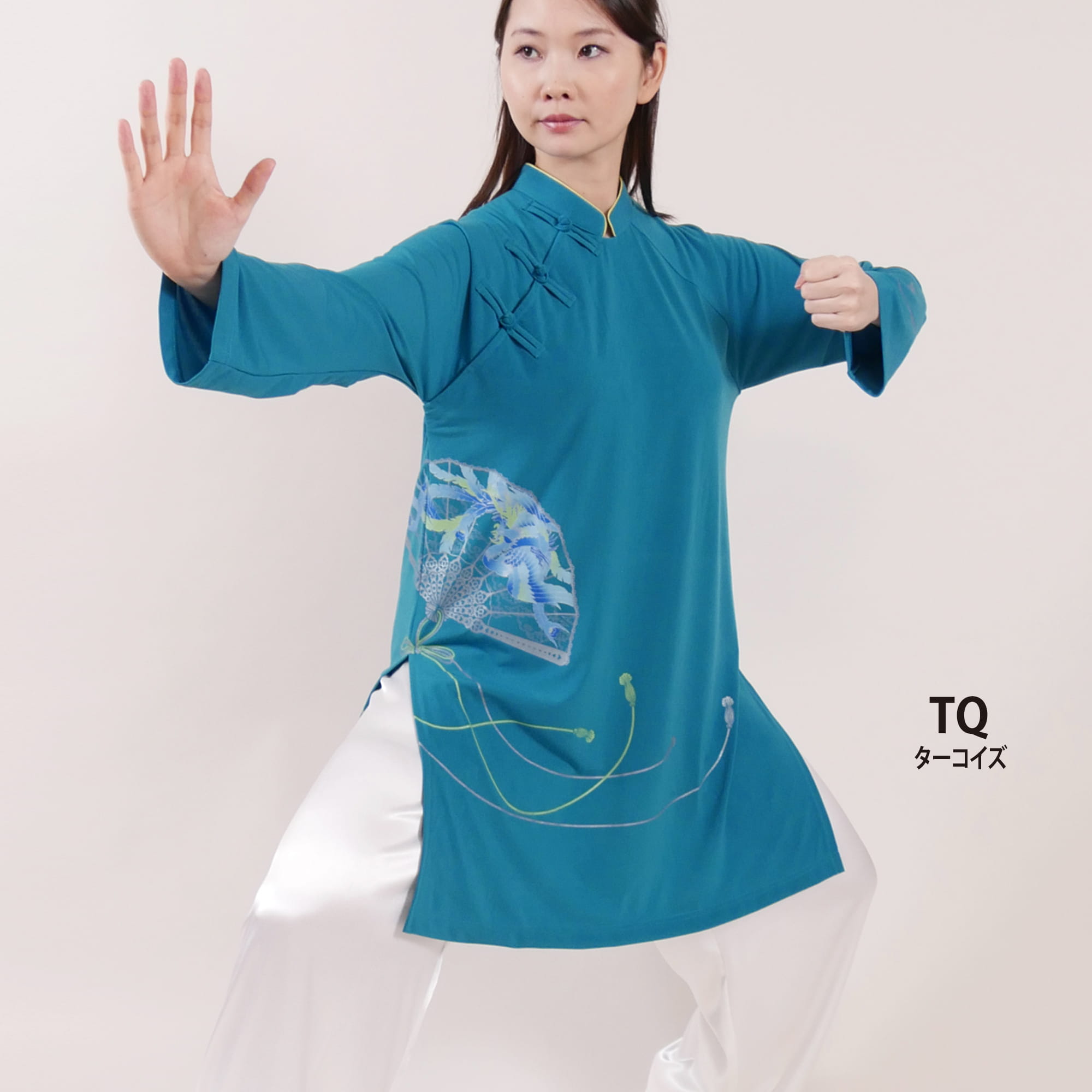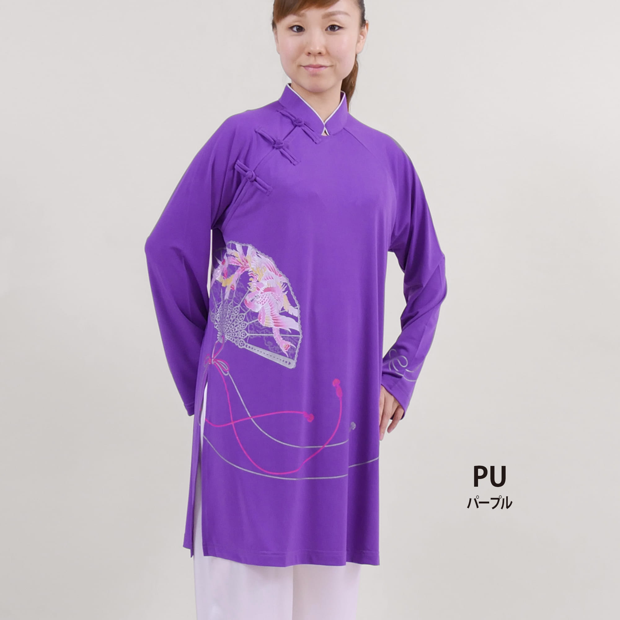 《長袍 扇(ちょうぱおおおぎ)》チャイナカラー 長袖&ロング丈 プリント